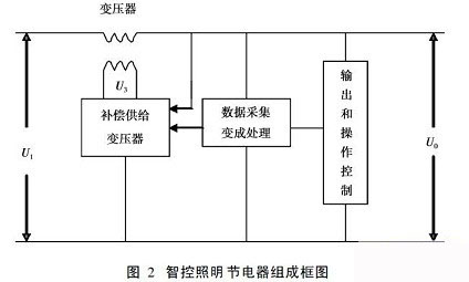 智控照明節(jié)電器主要由主變壓器、補(bǔ)償供給器、數(shù)據(jù)采集與編程處理、輸出和操作控制等四大部分組成(見圖2)。