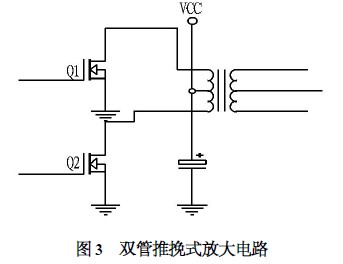 ( 3) 雙管推挽放大電路。圖3所示為雙管推挽放大電路。該方案采用了2 個MOS 管輪流導(dǎo)通,比采用4 個MOS管損耗低,而且輸出電壓比單端方式的要穩(wěn),為達到設(shè)計所需要的效率,本文選用了該方案。