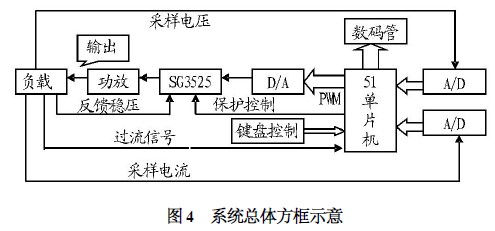 (2) 軟件實現(xiàn)自動保護控制。在負載端采樣電壓,通過單片機來查詢負載電平的高低控制SG3525 芯片的shutdown 端口來控制輸出,從而達到保護的目的。該方法簡單,且為后續(xù)智能化過載保護的實現(xiàn)提供基礎(chǔ)。通過對該電源電路進行方案論證,該系統(tǒng)的原理圖如圖4 所示。