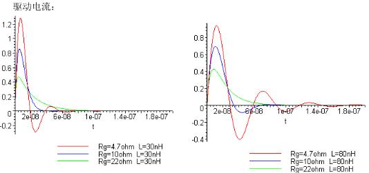 可以看到當Rg比較小時驅(qū)動電壓上沖會比較高,震蕩比較多,L越大越明顯,此時會對MOSFET及其他器件性能產(chǎn)生影響。但是阻值過大時驅(qū)動波形上升比較慢,當MOSFET有較大電流通過時會有不利影響。