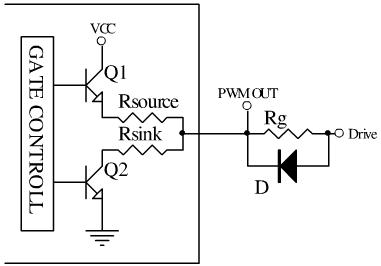 一般IC的PWM OUT輸出如左圖所示,內(nèi)部集成了限流電阻Rsource和Rsink,通常Rsource>Rsink,具體數(shù)值大小同IC的峰值驅(qū)動輸出能力有關(guān),可以近似認為R=Vcc/Ipeak。一般IC的驅(qū)動輸出能力在0.5A左右,因此Rsource在20Ω左右。