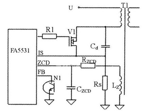 功率隔離變換器電路如圖5所示,由控制電路和反激式變換器組成。圖中,變壓器輔助繞組LZ、電阻RZCD、電容CzcD組成谷底探測電路,為控制芯片F(xiàn)A5531提供谷底檢測信號。光電耦合器N1次級將輸出電壓反饋信號輸入控制芯片。電路啟動后,F(xiàn)A5531輸出驅(qū)動信號使V1導通,V1電流上升,此電流由Rs檢測輸入到控制芯片的IS引腳,與由反饋輸入FB引腳的電壓決定的參考電壓進行比較,達到參考電壓時,V1關(guān)斷,變壓器繞組電壓反相,變壓器初級電感向次級負載饋送能量。當向次級饋送能量過程結(jié)束時,次級電流下降到零。變壓器漏感與開關(guān)管寄生電容Cd構(gòu)成了諧振電路,變壓器輔助繞組感應(yīng)此諧振電路的諧振電壓,并輸入到FA5531P的ZCD引腳。當次級電流下降到零時,諧振電路的諧振電壓迅速下降,輔助繞組的感應(yīng)電壓也迅速下降,當ZCD引腳上的電壓降至谷底探測閾值時,F(xiàn)A5531P驅(qū)動輸出使V1重新導通。由于電阻RzcD、電容CzcD會引入延時,選擇合適的RzcD、CzcD值,就可實現(xiàn)V1零電壓開通。