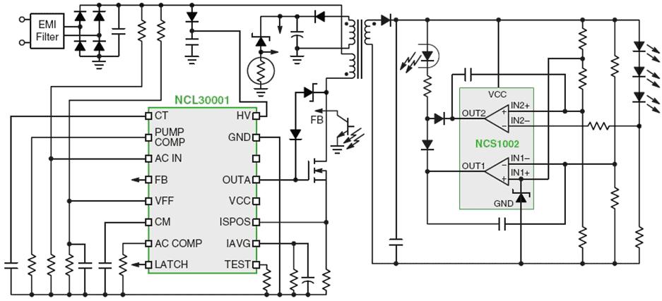 NCL30001是一種整體式/單段式的LED驅(qū)動(dòng)方案,這種方案集成了PFC和隔離型DC-DC轉(zhuǎn)換電路,并提供恒定電流來(lái)直接驅(qū)動(dòng)LED。這種方案相當(dāng)于將AC-DC轉(zhuǎn)換與LED驅(qū)動(dòng)兩部分電路整合在一起,均位于照明燈具內(nèi),省下了LED光條中集成的線性或DC-DC轉(zhuǎn)換器。這種整體式方案的電源轉(zhuǎn)換段更少,減少元器件使用數(shù)量(如光學(xué)元件、LED、電子元件及印制電路板等)、降低系統(tǒng)成本,并支持更高的LED電源總體能效。當(dāng)然,這種方案的功率密度更高,可能并不適合所有區(qū)域照明應(yīng)用,其光學(xué)圖案可能更適合較低功率的LED,典型應(yīng)用包括LED街燈、外墻燈、洗墻燈及電冰箱箱體照明等。