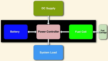 上述系統(tǒng)在使用的不同階段,能夠用做三種能源和兩種負(fù)載。當(dāng)該系統(tǒng)沒(méi)有插接直流電源時(shí),燃料電池和/或蓄電池的組合結(jié)構(gòu)能夠?yàn)橄到y(tǒng)負(fù)載供電。另外,當(dāng)直流電源不存在時(shí),燃料電池還能夠?qū)π铍姵剡M(jìn)行充電,以盡可能地增強(qiáng)電源斷電末期(end-of-power-shutdown)的性能,或者實(shí)現(xiàn)更好的系統(tǒng)動(dòng)態(tài)電源響應(yīng)特性。當(dāng)直流電源可用時(shí),它既對(duì)蓄電池進(jìn)行充電也對(duì)系統(tǒng)負(fù)載進(jìn)行供電。