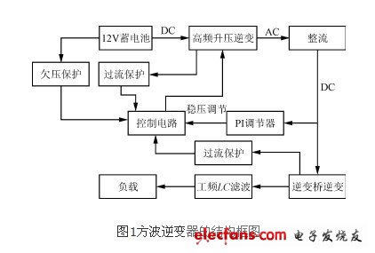 目前,構(gòu)成DC/AC逆變的新技術(shù)很多,但是考慮到具體的使用條件和成本以及可靠性,本電源仍然采用典型的二級變換,即DC/DC變換和DC/AC逆變。首先由DC/DC變換將DC 12V電壓逆變?yōu)楦哳l方波,經(jīng)高頻升壓變壓器升壓,再整流濾波得到一個穩(wěn)定的約320V直流電壓;然后再由DC/AC變換以方波逆變的方式,將穩(wěn)定的直流電壓逆變成有效值稍大于220V的方波電壓;再經(jīng)LC工頻濾波得到有效值為220V的50Hz交流電壓,以驅(qū)動負(fù)載。