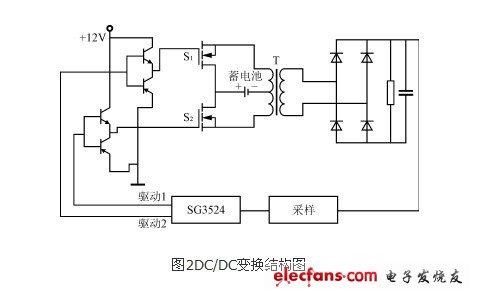 由于變壓器原邊電壓比較低,為了提高變壓器的利用率,降低成本,DC/DC變換如圖2所示,采用推挽式電路,原邊中心抽頭接蓄電池,兩端用開關(guān)管控制,交替工作,可以提高轉(zhuǎn)換效率。而推挽式電路用的開關(guān)器件少,雙端工作的變壓器的體積比較小,可提高占空比,增大輸出功率。