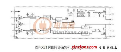 IR2110 的內(nèi)部結(jié)構(gòu)和工作原理框圖如圖4所示。圖中HIN和LIN為逆變橋中同一橋臂上下兩個功率MOS的驅(qū)動脈沖信號輸入端。SD為保護(hù)信號輸入端,當(dāng)該腳接高電平時,IR2110的輸出信號全被封鎖,其對應(yīng)的輸出端恒為低電平;而當(dāng)該腳接低電平時,IR2110的輸出信號跟隨HIN和LIN而變化,在實(shí)際電路里,該端接用戶的保護(hù)電路的輸出。HO和LO是兩路驅(qū)動信號輸出端,驅(qū)動同一橋臂的 MOSFET。