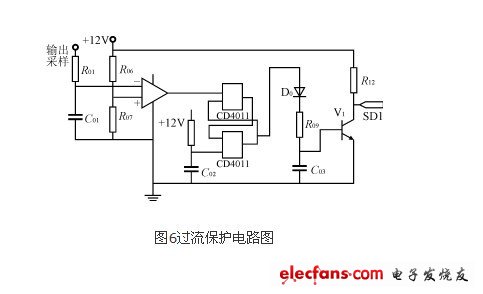 過流保護(hù)電路如圖6所示,它監(jiān)測輸出電流狀況,預(yù)設(shè)為1.5A。方波逆變器的輸出電流經(jīng)過采樣進(jìn)入運(yùn)算放大器的反向輸入端,當(dāng)輸出電流大于1.5A后,運(yùn)算放大器的輸出端跳轉(zhuǎn)為負(fù),經(jīng)過 CD4011組成的R-S觸發(fā)器后,使三級管V1基級的信號為低電平,三級管截止,向IR2011的SD1端輸出高電平,達(dá)到保護(hù)的目的。