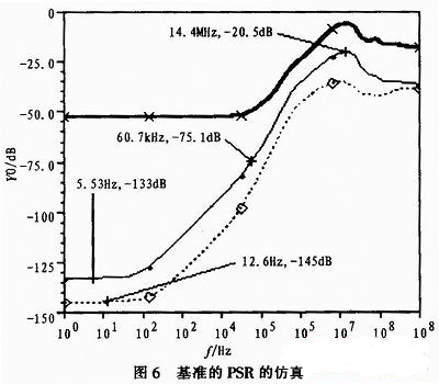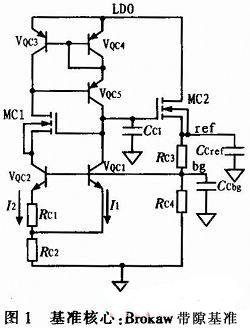 電子鎮(zhèn)流器的供電方式為半橋輸出接穩(wěn)壓管給芯片供電,其輸出電壓為高壓正弦波(50~100 kHz),加之芯片內(nèi)數(shù)字部分的干擾,這就給芯片的電源帶來較大的干擾。因此對芯片內(nèi)基準(zhǔn)的中頻PSR(Power Supply Rejection,電源抑制)有較大要求。本文從此角度在Brokaw帶隙基準(zhǔn)的基礎(chǔ)上進(jìn)行改進(jìn),采用LDO與基準(zhǔn)的級聯(lián)設(shè)計(jì)來增加其PSR。