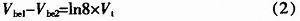 其中I是三極管射極電流,Is與射極面積成正比,n為一常數(shù),取1。這里,取VQC2:VQC1=8:1,因此Is2=8xIs1,又I1=I2,分別代入(1)并相除,整理得: