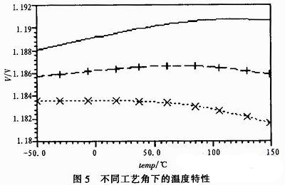圖5為不同工藝角下的溫漂仿真。仿真結(jié)果表明,此電路可以達(dá)到ref-45 ppm、bg-7.5 ppm的低溫漂。實(shí)際電路存在器件的不匹配和誤差等,雖然達(dá)不到理論上的溫漂,但通過仔細(xì)布版、修調(diào)帶隙核心電路中Rc1、Rc2,可以達(dá)到較低的溫漂。