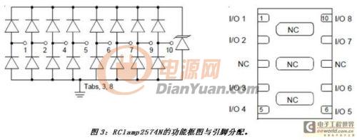 升特公司的最新以太網(wǎng)保護(hù)方案RClamp2574N可滿足并超過(guò)所有上述要求。建議將其放置于變壓器的PHY端,盡可能靠近磁體。RClamp2574N可配置為保護(hù)一個(gè)千兆以太網(wǎng)的全部四對(duì)差分線對(duì)。如圖3所示,八個(gè)I/O引腳中的每一個(gè)都有一個(gè)低電容的控向二極管對(duì),該器件用來(lái)將有害的浪涌電流引入內(nèi)部的低壓TVS二極管??叵蚨O管的工作電壓僅有2.5V,采用升特公司專利的EPD工藝技術(shù)制造。低壓導(dǎo)通是一個(gè)很重要的保護(hù)參數(shù),因?yàn)楹芏郟HY芯片都集成了ESD保護(hù)結(jié)構(gòu)。這些結(jié)構(gòu)并非針對(duì)承受很大的電能而設(shè)計(jì)。如果它們?cè)谕獠勘Wo(hù)實(shí)