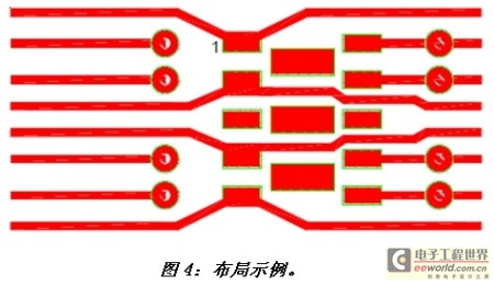 圖4顯示了RClamp2574N的流通型PCB走線。信號(hào)線連接到第1、2、4、5、6、7、9和10腳。第3腳與8腳連接到三個(gè)中心接地。在一個(gè)典型以太網(wǎng)應(yīng)用中,這些引腳以及接地都應(yīng)懸空(即不接地)。在本例中,走線寬度為0.005英寸。過(guò)孔用于第6、7、9和10腳的換層連接,這樣所有八根信號(hào)線都可采用易于實(shí)現(xiàn)的流通型(flow though)布局。