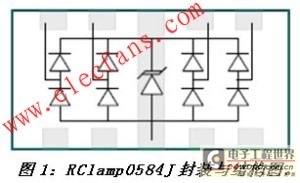 RClamp0584J是這種集成式TVS保護(hù)器件的一個(gè)最佳實(shí)例(圖1)。該器件是RailClamp系列高速接口保護(hù)產(chǎn)品的最新成員。這種四線、5V工作電壓保護(hù)器件的性能超出了IEC 6100-4-2 level 4對(duì)靜電瞬變的保護(hù)要求。圖1同時(shí)也明確顯示,這款器件采用了獨(dú)特的封裝設(shè)計(jì)。“穿通型(Flow through)”封裝一詞來(lái)自升特公司,這種封裝允許走線直接穿過(guò)保護(hù)器件,因此最大限度地減小了由于平衡差分線對(duì)的中斷或失配所導(dǎo)致的額外寄生電感與電容。