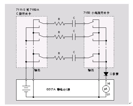 一個(gè)“同軸三柱-BNC”轉(zhuǎn)換器(7078-TRX-BNC型)被用于將6517A連接到7158型開(kāi)關(guān)卡。電容器通過(guò)低噪聲同軸電纜連接到7158型開(kāi)關(guān)卡??墒褂媒^緣線(xiàn)將7111-S開(kāi)關(guān)卡連接到電容器。7169A型是通過(guò)接線(xiàn)頭連接器進(jìn)行連接。