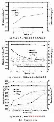 針對(duì)nLDMOS器件開態(tài)耐壓低的問(wèn)題,有針對(duì)性地仿真了溝道長(zhǎng)度、多晶硅柵場(chǎng)板長(zhǎng)度及體區(qū)濃度對(duì)開態(tài)耐壓的影響。圖5(a)為nLDMOS的關(guān)態(tài)耐壓、開態(tài)耐壓及閾值與溝道長(zhǎng)度(Lch)的關(guān)系??梢钥闯鰷系篱L(zhǎng)度對(duì)器件的開態(tài)耐壓和關(guān)態(tài)耐壓影響很小。閾值隨著溝道長(zhǎng)度的增加而增加,這是由于采用橫向雙擴(kuò)散形成溝道,所以隨著溝道長(zhǎng)度增加,p型體區(qū)的濃度越來(lái)越大,閾值也就越來(lái)越大。圖5(b)為nLDMOS的關(guān)態(tài)耐壓、開態(tài)耐壓及閾值與多晶硅柵極場(chǎng)板長(zhǎng)度(LPgate)的關(guān)系。在柵極場(chǎng)板較長(zhǎng)時(shí),其對(duì)閾值和關(guān)態(tài)耐壓影響很小,當(dāng)柵極場(chǎng)板縮短到多晶硅柵不能覆蓋溝道時(shí),器件的開態(tài)耐壓大幅增加。這時(shí)閾值也迅速增加。雖然多晶硅柵不能完全覆蓋溝道,但是由于開態(tài)時(shí)nLDMOS的柵漏電壓差很大,所以仍然能夠在表面形成反型層溝道。因此,大幅減短?hào)艠O場(chǎng)板能有效提高器件的開態(tài)耐壓,但是同時(shí)也帶來(lái)了器件不能有效開啟的問(wèn)題。圖5(c)為nLDMOS的關(guān)態(tài)耐壓、開態(tài)耐壓及閾值與體區(qū)注入劑量(Pbody)的關(guān)系??梢钥闯鲈黾芋w區(qū)的注入劑量對(duì)器件的耐壓影響很小。但是隨著注入劑量的增加,體區(qū)濃度增加,所以閾值就增加,同時(shí)器件的開態(tài)耐壓也隨之增加。當(dāng)體區(qū)注入劑量達(dá)到5e14cm-2時(shí),閾值增加緩慢,開態(tài)耐壓卻大幅增加,所以只能通過(guò)閾值上的犧牲來(lái)改善nLDMOS的開態(tài)擊穿耐壓。