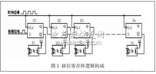 移位寄存陣是由D 觸發(fā)器串聯(lián)構(gòu)成的,它與光電繼電器一起構(gòu)成選通電路。圖3 中,D1,D2,……Dn 表示的是D 觸發(fā)器,每個D 觸發(fā)器的輸出Q 是下一個D 觸發(fā)器的數(shù)據(jù)信號,所有的D 觸發(fā)器由相同的時鐘信號控制。D 觸發(fā)器的反碼輸出Q 用來控制對應(yīng)的光電繼電器的通斷,當(dāng)Q 為高電平時光電繼電器斷開,當(dāng)Q 為低電平時光電繼電器導(dǎo)通。通過控制第一個D 觸發(fā)器的數(shù)據(jù)信號,可實現(xiàn)D1,D2,……Dn 的Q 逐個輸出低電平即移位功能,從而控制光電繼電器K1,K2,……Kn按順序的逐個單獨閉合,實現(xiàn)通道選通功能。
