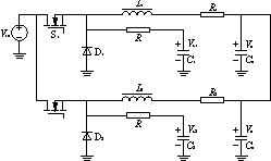 式中:Vc1、Vc2分別為C1和C2上電壓的平均值;IL1、IL2分別是L-和L2流過(guò)電流的平均值,亦即兩路輸出電流平均值;R1及R2是濾波電感的等效串聯(lián)電阻,當(dāng)在工藝上設(shè)計(jì)并聯(lián)電源每路輸出電感基本上一樣時(shí),可以認(rèn)為R1=R2。因此,要控制兩路電流均流,即要求IL1=IL2,于是,只要控制Vc1=Vc2就行了。所以,電容C1及C2上的電壓Vc1和Vc2可以代表兩路電流IL1及IL2大小,可用來(lái)進(jìn)行均流控制。