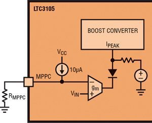 圖4顯示了LTC3105 使用的最大功率點控制機制的模型。圖3顯示了光伏電池的功率曲線。請注意,當電池電壓上升而離開峰值功率點時,光伏電池的功率就會從峰值點急劇下降。因此,一般更希望低于理想值而不是高于理想值的控制電壓,因為功率曲線在高壓端下降得更快。