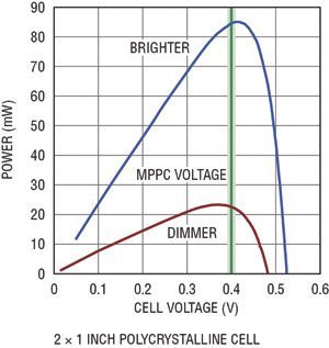 就圖5所示功率曲線而言,0.4V的MPPC電壓在兩種極端照明條件下都產(chǎn)生接近最大功率點的性能。在這兩種情況下,與最大功率點之間的電壓差約為20mV,從而產(chǎn)生了不到3%的功率損失。