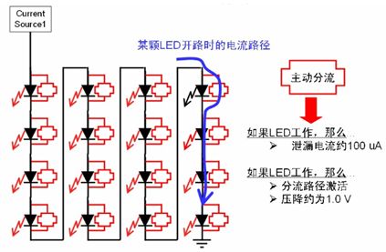 區(qū)域照明應(yīng)用中通常會采用多串LED,雖然LED本身可靠性高,但若LED串中的某個LED開路,那么整串LED就可能關(guān)閉,而街道照明等應(yīng)用中必須避免這種狀況,從而降低后期維護成本。為了增強LED串的可靠性,這種安森美半導體推出了NUD4700 LED電流旁路保護器。NUD4700器件是一款分流器件,當LED串中某個LED開路時,就會提供電流旁路,確保整串LED不會關(guān)閉;而且恰當處理散熱的話,還可支持大于1 A的大電流,其工作原理如圖8所示。
