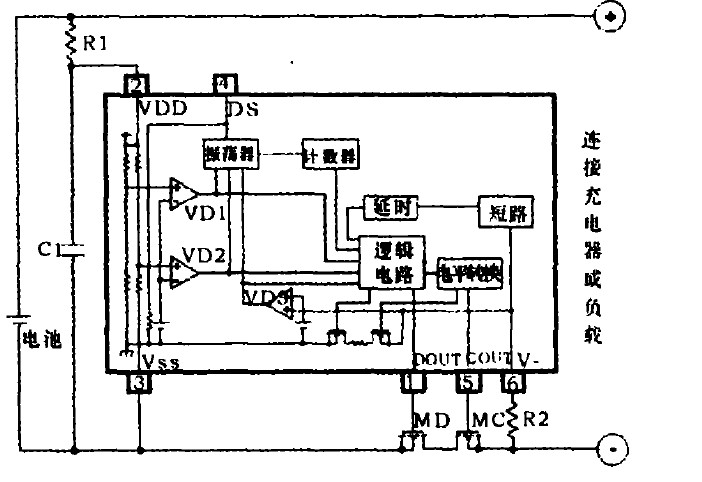 圖1中,DOUT為過放電檢測的CMOS輸出,COUT為過充電檢測的CMOS輸出,VDD為電池電壓輸入,VSS為芯片接地引腳,DS為響應(yīng)延遲時間縮短控制輸入端,V-為放電過流檢測端。