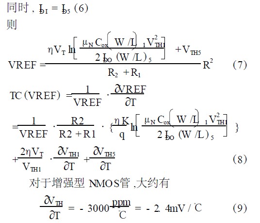 即對于增強型NMOS管,VTH隨溫度升高而下降,而對于耗盡型NMOS管,VTH為負值,其絕對值隨溫度升高而上升。由此推得,當選取合適的參數(shù)時,本電路的溫度漂移可以控制在較小范圍內(nèi)。