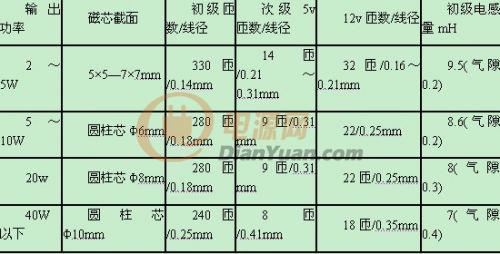 制作RCC型電源關(guān)鍵是脈沖變壓器T的繞制。無論何種開關(guān)電源脈沖變壓器的計(jì)算是極繁瑣又極不準(zhǔn)確的,對業(yè)余制作者來說通過估算,實(shí)驗(yàn)調(diào)整來確定比較實(shí)際。即使是估算也涉及磁芯材料,結(jié)構(gòu)的影響,限于目前市場產(chǎn)品參數(shù)的離散性,業(yè)余者也難以確定,此處只列出部分計(jì)算結(jié)果供參考。小功率開關(guān)電源脈沖變壓器制作參數(shù)(繞組功能參考附圖)如附表所示。