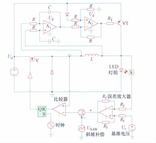 圖4 大功率LED 模型圖控制電路采用傳統(tǒng)峰值電流控制,設定參考電壓Ur = 10. 5 V; 電壓采樣系數(shù)ku = 0. 8; 電流采樣系數(shù)為ki = 1; 誤差放大器放大倍數(shù)設為1; 時鐘頻率fs = 200 kHz; 占空比為0. 1。該電路占空比D > 0. 5,需要斜坡補償。根據(jù)斜坡補償原則:所選定斜坡上升斜率m>-m2/2,其中m2為電感電流下降斜率。選定鋸齒波幅值為0. 8 V、頻率為200 kHz。