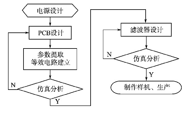 如果以上所有降低EMI的措施都完成了還沒(méi)有達(dá)到EMC的標(biāo)準(zhǔn),就可以根據(jù)前面仿真分析得到的差模和共模干擾的波形對(duì)濾波器進(jìn)行設(shè)計(jì)。在設(shè)計(jì)濾波器的時(shí)候,也同樣要注意元件的布局,還有PCB寄生參數(shù)對(duì)濾波器阻抗的影響,其本質(zhì)也是增大對(duì)干擾的阻抗,使干擾無(wú)法通過(guò)傳播路徑。開(kāi)關(guān)電源設(shè)計(jì)流程如圖5所示。