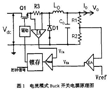 開關(guān)電源可以有很多種結(jié)構(gòu),但原理基本相似。圖1是電流模式降壓斬波fg(Buck)開關(guān)電源的原理圖。它和電壓模式的主要區(qū)別是增加了電流采樣電阻R3和電流放大器IA. R3的阻值一般很小,以避免大的功耗。功率管Ql在每個(gè)周期開始的時(shí)候開啟并維持一段時(shí)間Ton,通過濾波電感Lo對濾波電容C。充電、同時(shí)向負(fù)載提供電流,此時(shí)Lo上電流隨時(shí)間的變化率為