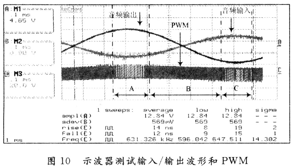 圖10測試了TFA9810T功放音頻輸入端為1 kHz的2V。單音頻信號波形,輸出端揚(yáng)聲器端到GND間為12.84V。,圖9中LPF。濾波前功放輸出的PWM波形。圖11~圖13分別拓展了圖10中A/B/C區(qū)。