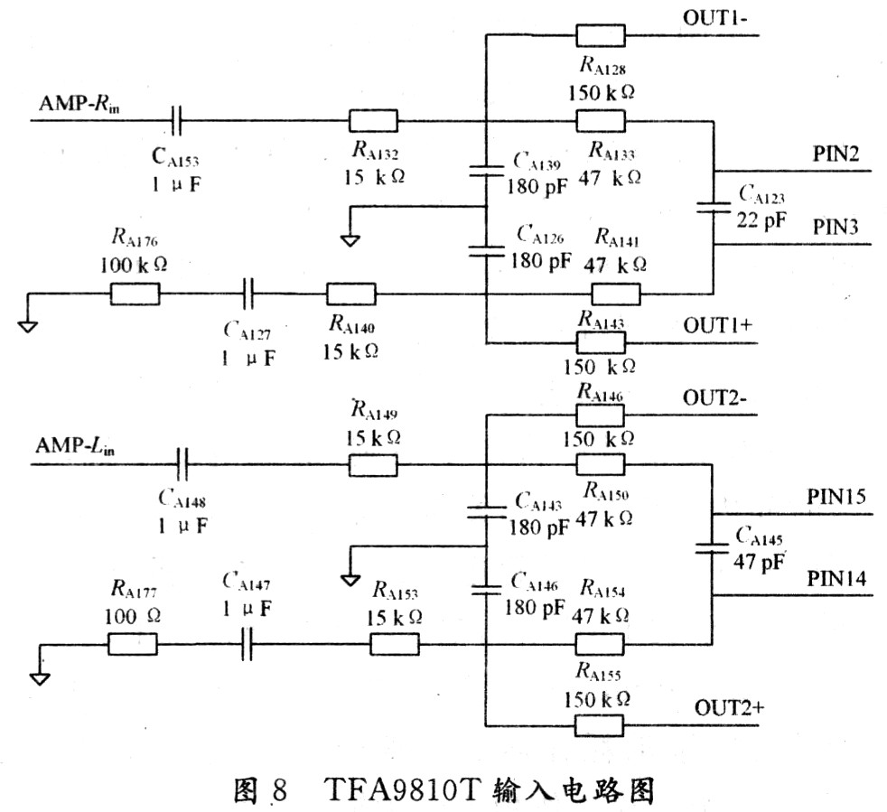 TFA9810T輸入端采用可抑制共模干擾的全差分輸入電路。以圖8 AMP-Rin輸入端為例,RA128/RA133/CA139構(gòu)成負(fù)反饋低通濾波器,用于衰減反饋信號中高頻載波成分。增加低頻成分反饋量,特別是直流成分。有效改善了零輸入時因輸入信號直流電平與比較器門限電壓差異形成的占空比誤差,調(diào)整RA128也可實(shí)現(xiàn)TFA9810T增益控制,使Au(dB)=20log(VOUT/VIN)≌20log(RA128/RA132)。器件CA153/RA132/RA133及TFA9810T內(nèi)阻構(gòu)成高通濾波器,用于對輸入信號的緩沖。若CA153容值過小,會影響低頻響應(yīng),理論確定公式為: