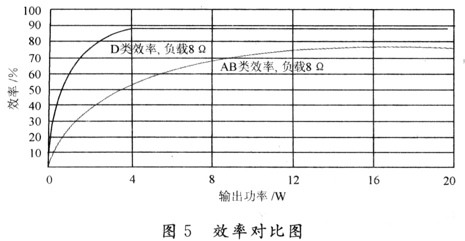 由上述公式得知,D類功放中負(fù)載RL,相對其他電阻,比值越大效率越高;MOSFET作為續(xù)流開關(guān),所消耗的功率幾乎等于MOSFET導(dǎo)通阻抗上I2RON損耗和靜態(tài)電流總和,相比較輸出到負(fù)載的功率幾乎可忽略。所以,其效率遠(yuǎn)高于線性功放,如圖5所示。非常適應(yīng)現(xiàn)今綠色節(jié)能的要求,適合被平板等數(shù)字視聽產(chǎn)品規(guī)模使用。