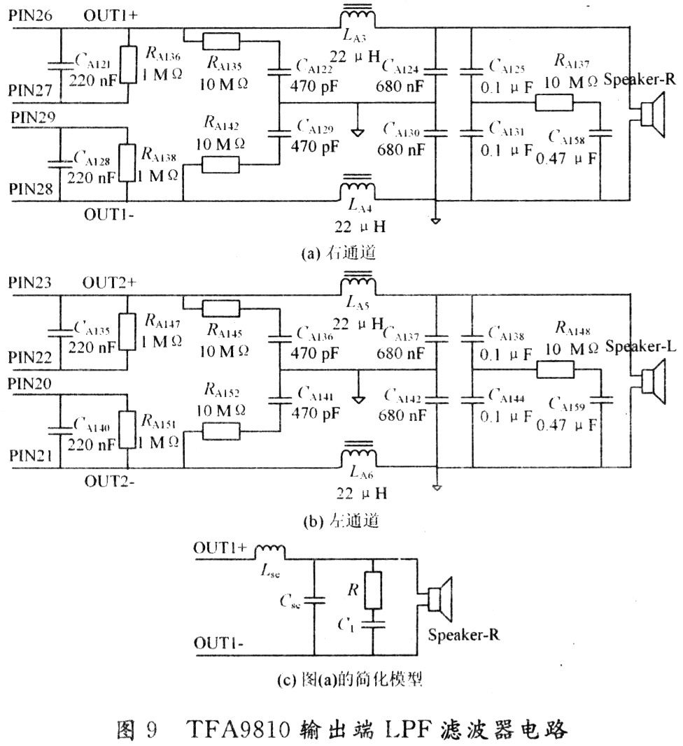 TFA9810T輸出端低通濾波器采用二階巴特沃思濾波器方式,實(shí)際的巴特沃思二階濾波器由圖9中RCA類電子元器件CA135/RA145/CA136/LA5/CA137/CA138/RA148/CA159/CA140/CA141/RA152/LA6/CA142/CA144等構(gòu)成,對PWM方波中15 Hz~20 kHz音頻成分表現(xiàn)為直通效應(yīng),對超過音頻范圍的20 kHz以上高頻成分呈現(xiàn)-12 dB/倍頻程滾降率。