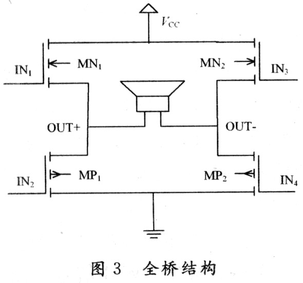 全橋MOSFET管輪流成對導(dǎo)通,理想狀態(tài)一對導(dǎo)通,另一對截止,但實(shí)際上功率管的開啟關(guān)斷有一個過程。過渡過程中,必有一瞬間,如圖3所示,在IN1/IN3尚未徹底關(guān)斷時IN2/IN4就已開始導(dǎo)通;因MOSFET全部跨接于電源兩端,故極端的時間內(nèi),可能會有很大的電壓電流同時加在4個MOSFET上,導(dǎo)致功耗很大,整體效率下降,而且器件溫升加劇,燒壞MOSFET,降低可靠性。為避免兩對MOSFET同處導(dǎo)通狀態(tài),引起有潛在威脅的很大短路電流,應(yīng)保證一對MOSFET導(dǎo)通和另一對MOSFET截止期間有一個很短的停滯死區(qū)時間(Dead-time),這個時間由Logic邏輯控制器控制,以有效保證一組MOSFET關(guān)斷后,另一組MOSFET再適時開啟,減小MOSFET損耗,提高放大器效率。