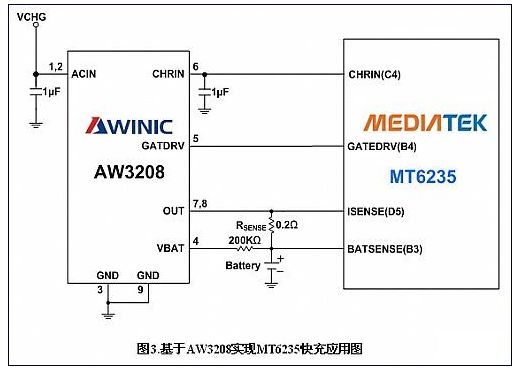 上海艾為電子專門針對MT6235/36平臺推出的AW3208在增加OVP功能的同時,提供了智能充電功能,以滿足快速充電的功能。如圖2所示,AW3208內(nèi)置專有的K-ChargeTM技術(shù),可根據(jù)芯片溫度智能調(diào)整輸出電流,以保證在充電期間整個充電系統(tǒng)的安全。使得手機在實現(xiàn)快速充電的時候不會因為由于環(huán)境溫度較高或者充電電流過大導(dǎo)致芯片進入過溫保護使得充電沒法正常進行。圖3為在MT6235上的典型應(yīng)用圖。