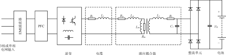 圖2給出電動(dòng)汽車(chē)感應(yīng)耦合充電系統(tǒng)的簡(jiǎn)化功率流圖。圖中,輸入電網(wǎng)交流電經(jīng)過(guò)整流后,通過(guò)高頻逆變環(huán)節(jié),經(jīng)電纜傳輸通過(guò)感應(yīng)耦合器后,傳送到電動(dòng)汽車(chē)輸入端,再經(jīng)過(guò)整流濾波環(huán)節(jié),給電動(dòng)汽車(chē)車(chē)載蓄電池充電。