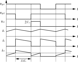 當(dāng)原邊開(kāi)關(guān)管S1及S2均開(kāi)通時(shí),能量?jī)?chǔ)存在輸入濾波電感中,同時(shí)輸出整流管處于關(guān)斷態(tài)。當(dāng)開(kāi)關(guān)管S1及S2中任一個(gè)開(kāi)關(guān)管關(guān)斷時(shí),儲(chǔ)存能量通過(guò)原邊繞組傳輸?shù)礁边?。由于變換器的對(duì)稱(chēng)工作,變壓器磁通得以復(fù)位平衡。