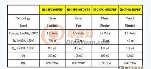 表1顯示了四個擁有相同尺寸的IGBT的參數(shù)值。前三個IGBT采用同樣的平面式技術,但使用不同的壽命復合控制計量。從表中可見,標準速度的IGBT具有最低Vce(on) ,但與快速和超速平面式IGBT相比,標準速度的IGBT下降時間最慢。第四個IGBT是經優(yōu)化的槽柵IGBT,能夠為太陽能逆變器這類高頻率切換應用提供低導通和開關損耗。請注意,槽柵IGBT的Vce(on) 和總切換損耗 (Ets) 比超速平面式IGBT低。