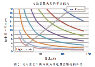 主動平衡系統(tǒng)的性能取決于平衡電流與電池充電和放電率之間的比率。電池的不平衡率越高而且充電或放電率越大,所需的平衡電流便越高。主動式電池管理系統(tǒng)可以在充電或放電時為小電池之間的儲電量差額提供補償(假設(shè)采用的平衡電流恒定不變),圖2顯示這個差額的補償數(shù)值。