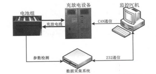 測試平臺的結(jié)構(gòu)如圖1所示,以單片機為核心的電池數(shù)據(jù)采集系統(tǒng)直接對電池組的單體電壓、總電壓、溫度、電流、充放電容量、充放電能量等信息進行精確測量,并通過RS232總線將數(shù)據(jù)發(fā)送到上位機。由微型計算機構(gòu)成的上位機監(jiān)控系統(tǒng), 實時顯示并記錄接收到的測試數(shù)據(jù), 對數(shù)據(jù)進行分析,監(jiān)控測試系統(tǒng)工作狀態(tài)。另外可根據(jù)具體的實驗要求,控制充放電設備按照編程指令輸出電流,模擬電池在某些特定條件下的使用情況。充放電設備實現(xiàn)電池組的充放電, 完成電池和電網(wǎng)之間能量的雙向流動, 與監(jiān)控PC 機通過CAN 通信, 可接收監(jiān)控PC機的編程控制指令。文中主要完成數(shù)據(jù)采集系統(tǒng)、上位機監(jiān)控系統(tǒng)的設計并實現(xiàn)各部分之間的實時通訊。