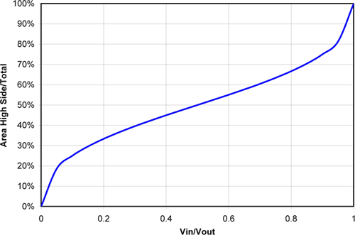 通過圖1,我們知道 50% 轉(zhuǎn)換比率時出現(xiàn)最佳傳導損耗極值。但是,在其他轉(zhuǎn)換比率條件下,可以將損耗降至這一水平以下。附錄 1 給出了進行這種優(yōu)化的數(shù)學計算方法,而圖 2 顯示了其計算結(jié)果。即使在極低的轉(zhuǎn)換比率條件下,F(xiàn)ET 芯片面積的很大一部分都應該用于高側(cè) FET。高轉(zhuǎn)換比率時同樣如此;應該有很大一部分面積用于低側(cè)。這些結(jié)果是對這一問題的初步研究,其并未包括如高側(cè)和低側(cè)FET之間的各種具體電阻值,開關(guān)速度的影響,或者對這種芯片面積進行封裝相關(guān)的成本和電阻等諸多方面。但是,它為確定 FET 之間的電阻比提供了一個良好的開端,并且應會在FET選擇方面實現(xiàn)更好的整體折中。