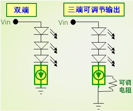 適合低電流LED應(yīng)用的CCR,可以采用安森美半導(dǎo)體運(yùn)用專(zhuān)利自偏置晶體管(SBT)技術(shù)開(kāi)發(fā)出來(lái)得NSI45系列。這系列CCR包含雙端固定輸出和三端可調(diào)節(jié)輸出兩種類(lèi)型,電流等級(jí)涵蓋10至180 mA,雙端及三端CCR電路圖如圖2所示。其中三端可調(diào)節(jié)輸出CCR包括電流30至80 mA(SOT-223)及60至150 mA(DPAK)等不同選擇,能夠用于滿足特定電流設(shè)置要求。