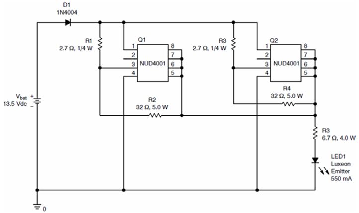 圖4:NUD4001在汽車(chē)停車(chē)燈中的應(yīng)用示例[page]
