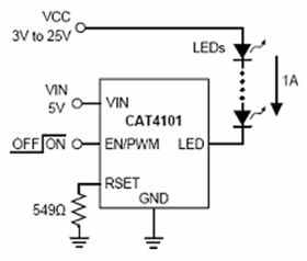 而在要求驅(qū)動(dòng)大電流的高亮度LED汽車(chē)照明應(yīng)用中,可以采用安森美半導(dǎo)體的CAT4101高亮度線性LED驅(qū)動(dòng)器。CAT4101能驅(qū)動(dòng)一串電流高達(dá)1 A的高亮度LED,且滿載時(shí)的壓降僅為極低的0.5 V。這種簡(jiǎn)單方案不要求電感,消除開(kāi)關(guān)噪聲,將元件數(shù)量減至最少,并簡(jiǎn)化設(shè)計(jì),典型應(yīng)用電路如圖5所示。
