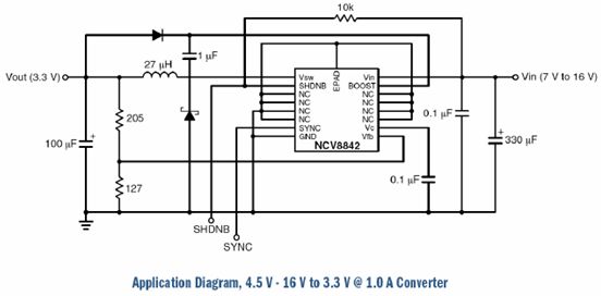 在降壓開(kāi)關(guān)驅(qū)動(dòng)器方面,包括NCV8842、NCV8843及NCV51411等產(chǎn)品,適合于車(chē)身/遠(yuǎn)程信息系統(tǒng)等應(yīng)用。NCV8842/3是帶同步功能的1.5 A、170/340 kHz降壓驅(qū)動(dòng)器,支持4.5 V至40 V輸入電壓,而輸出電壓可從1.27 V開(kāi)始編程設(shè)定。同步引腳功能用于改善EMI性能。