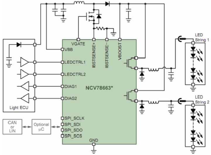 一般而言,汽車(chē)前照燈要求支持從單個(gè)LED到多串LED,電壓可高達(dá)60 V;此外,還要求支持脈寬調(diào)制(PWM)調(diào)光(如用于示廓燈)、高集成度、高能效、LED串低電磁輻射、集成診斷及通信接口等。安森美半導(dǎo)體針對(duì)LED汽車(chē)前照燈系統(tǒng)開(kāi)發(fā)了NCV78663電源鎮(zhèn)流器及雙LED驅(qū)動(dòng)器。NCV78663是先進(jìn)的高可靠性、高能效的系統(tǒng)級(jí)芯片(SoC) LED驅(qū)動(dòng)器,支持達(dá)2 A電流,提供高于90%的總能效,驅(qū)動(dòng)高達(dá)60 V電壓的多串LED,能以PWM調(diào)光維持色溫及控制平均電流,使設(shè)計(jì)人員能夠以一顆高集成度的SoC控制遠(yuǎn)光燈及近光燈、日間行車(chē)燈、轉(zhuǎn)向指示燈及霧燈,所需外部元件極少。這器件通過(guò)SPI接口與外部微控制器通信,在上電后動(dòng)態(tài)地控制系統(tǒng)參數(shù)、檢測(cè)LED工作狀態(tài)并反饋診斷信息。圖8顯示的是NCV78663在先進(jìn)的汽車(chē)前照燈應(yīng)用中的電路圖。