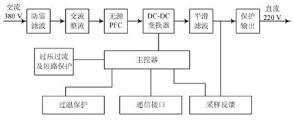 本文設(shè)計(jì)的整流模塊的工作原理框圖如圖2 所示,工作時(shí), 模塊首先通過(guò)過(guò)防雷處理和濾波對(duì)輸入的三相交流進(jìn)行處理, 這樣才能保證模塊后級(jí)電路的安全; 經(jīng)過(guò)處理后的三相交流經(jīng)過(guò)整流和無(wú)源PFC 后轉(zhuǎn)換成高壓直流時(shí), 這時(shí)轉(zhuǎn)換的高壓直流要經(jīng)過(guò)DC/ DC 變換器再次轉(zhuǎn)換成可變的直流電壓輸出; 另外模塊控制部分還有負(fù)責(zé)過(guò)壓、過(guò)流以及短路保護(hù)等作用, 這樣才能保證輸出電壓的穩(wěn)定, 也同時(shí)能對(duì)模塊各部件進(jìn)行保護(hù)。模塊還在遠(yuǎn)程監(jiān)控中提供了 四遙 ( 遙控、遙調(diào)、遙測(cè)、遙信) 接口。