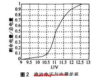 系統(tǒng)工作時(shí)間與電池電量成線性關(guān)系, 而電量與電池端電壓為非線性關(guān)系。圖2 所示為本系統(tǒng)所用電池在2 000 mA 恒流放電的情況下, 電池端電壓與電量的關(guān)系曲線, 其中橫軸為電池電壓, 縱軸為剩余電量相對(duì)于總電量的百分比。根據(jù)此曲線, 在MCU 軟件中擬合一個(gè)電壓與電量關(guān)系的數(shù)據(jù)表, 同時(shí)設(shè)置10 V為告警電壓; 系統(tǒng)可以實(shí)時(shí)查詢諸如電池電壓、電流、剩余電量、估計(jì)供電時(shí)間等信息, 并同時(shí)仿手機(jī)做成3段式顯示, 使上位機(jī)全面掌握電池狀態(tài),決定控制策略, 從而提高系統(tǒng)運(yùn)行可靠性。MCU 軟件使用KeiluV2 軟件開發(fā), 上位機(jī)軟件使用LabWindow s 軟件開發(fā)。MCU 除完成電量查詢相關(guān)功能, 還要完成報(bào)警與顯示功能; 上位機(jī)軟件同時(shí)要完成環(huán)境參數(shù)的相關(guān)采集與處理。